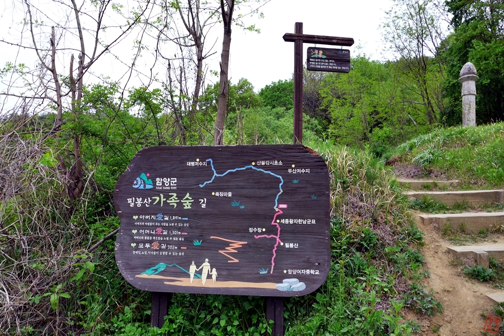 코스: 상림공원 주차장 -> 필봉산 -> 세종왕자 한남군묘역 -> 두산저수지 -> 백암산 -> 막고개 -> 산불감시초소 -> 천년의숲 -> 역사인물공원 -> 상림약수터 -> 상림공원 주차장