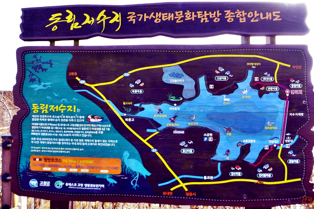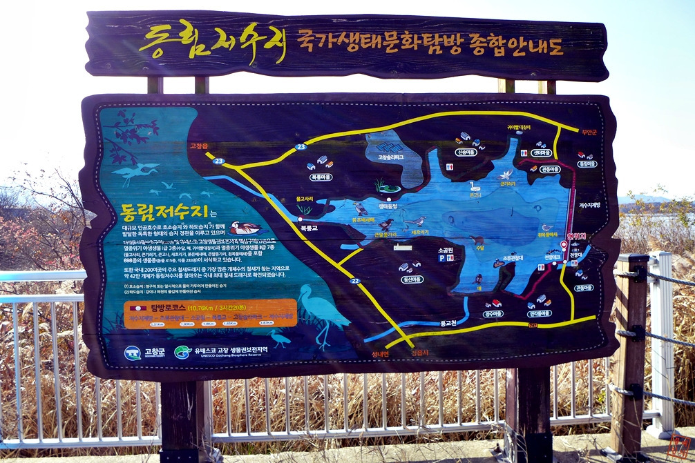 코스: 2층 전망대(팔각정) -> 조류관찰대 -> 소공원 -> 복룡교 -> 고창솔라파크 수변길 -> 관동마을 -> 저수지 제방 -> 2층 전망대(팔각정)