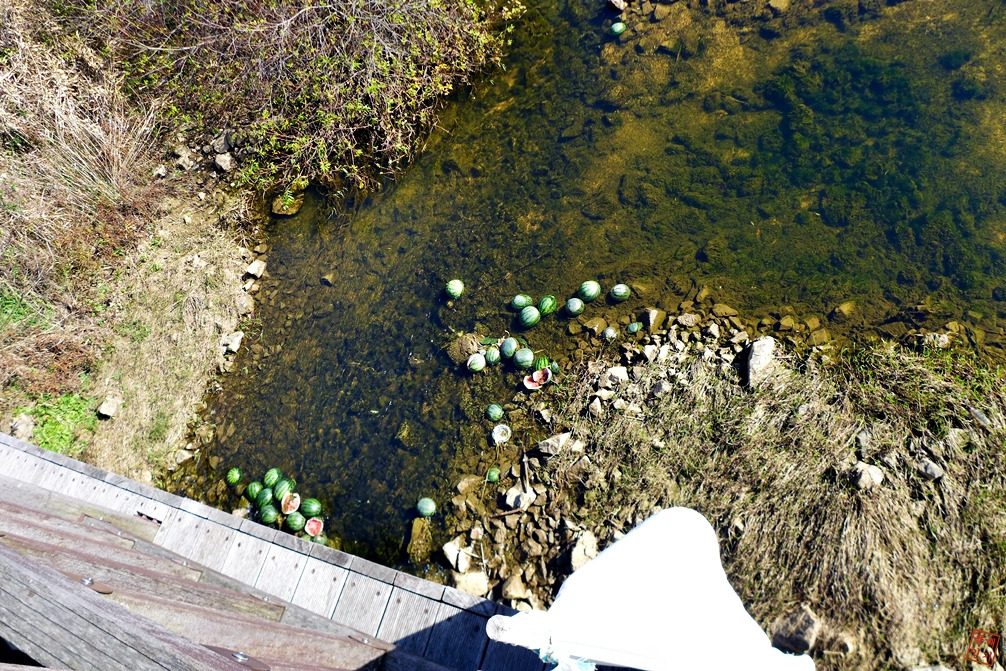 다리 아래 하천을 보니 멀쩡한 수박이 100여개 이상 버러져 있다.